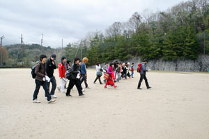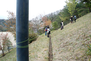 黄色い糸を張って、眼隠しでその線をつたって歩く。
